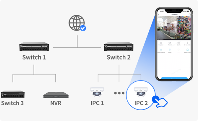 UNV switch automatically detects IP cameras and NVRs, generating a visual topology. Users can access the switch management interface or jump directly to IP cameras to view live footage.