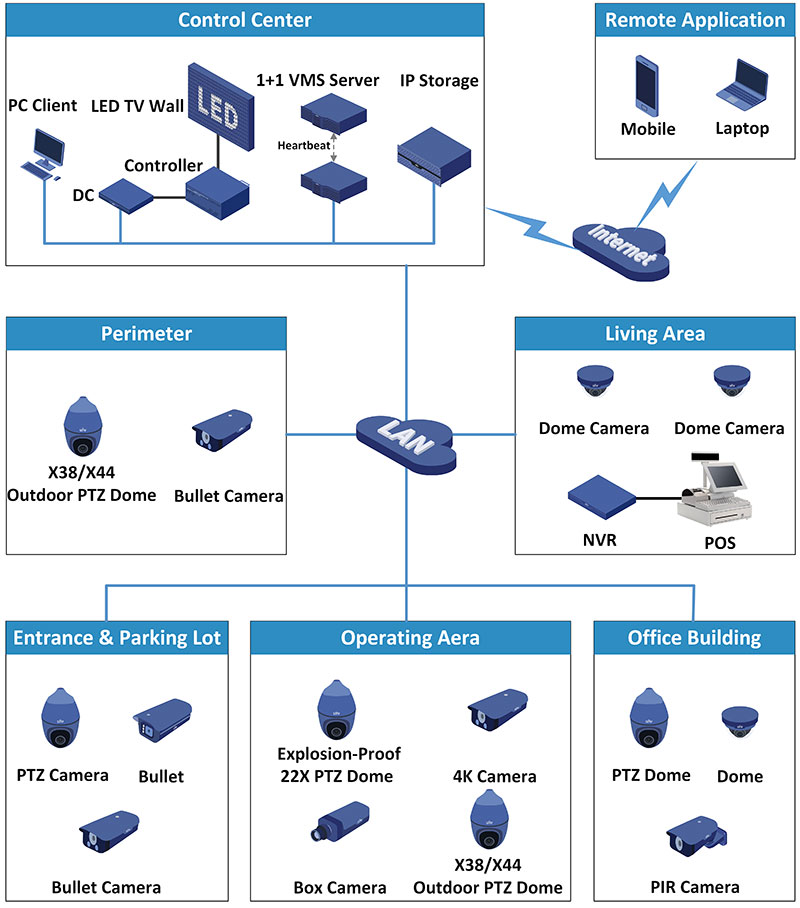 Based on different subdivision industries, industrial park surveillance solution can be further divided into energy, steel, machinery, chemical surveillance solution and so on. Uniview has been dedicating to video surveillance industry for years, accumulated much experience and knowledge in varied industrial park projects. Uniview now present a comprehensive industrial park surveillance solution which can be applied to all kinds of industrial park surveillance projects.